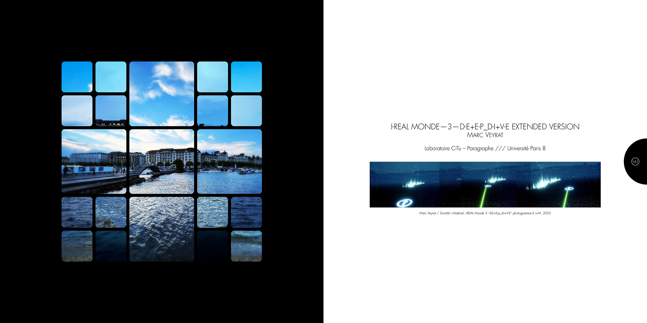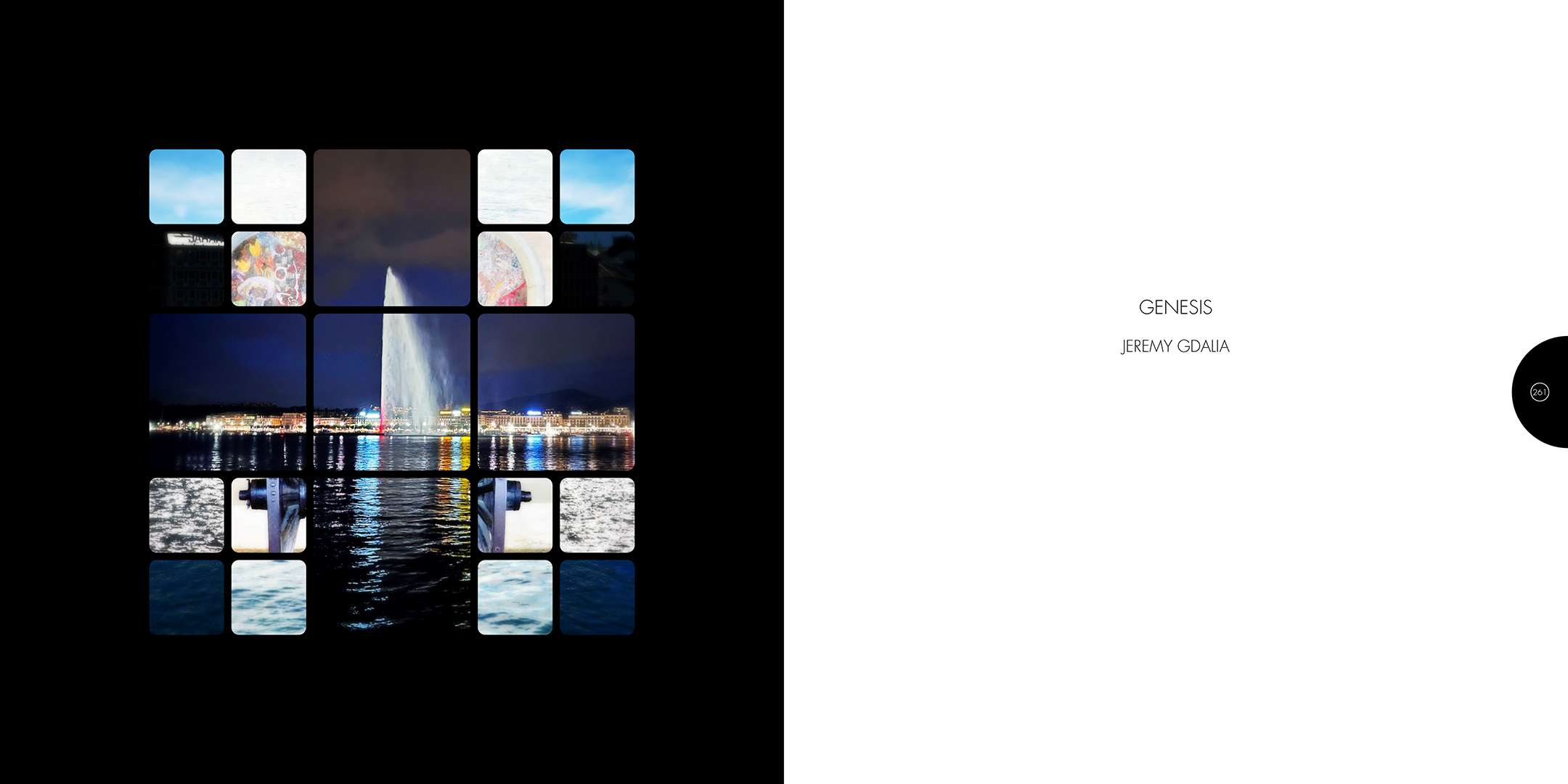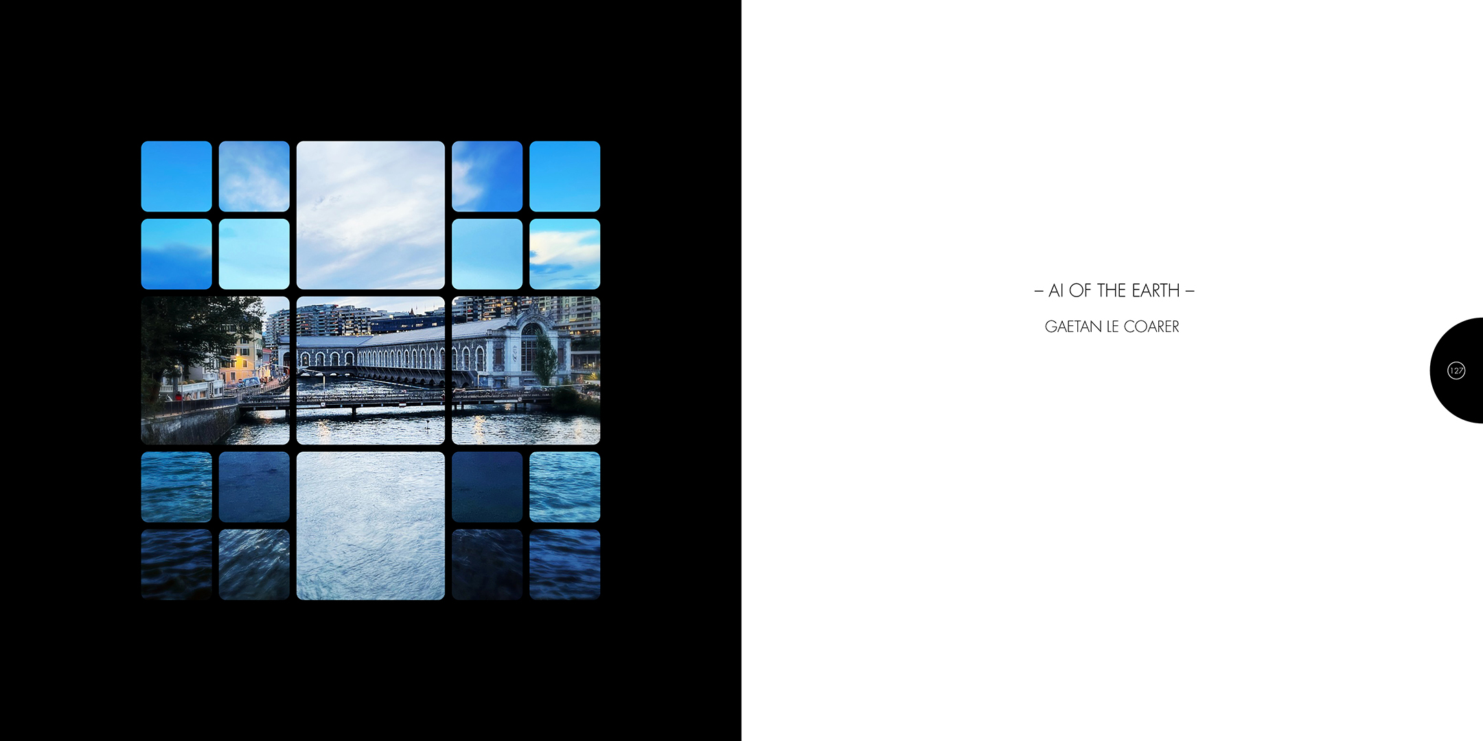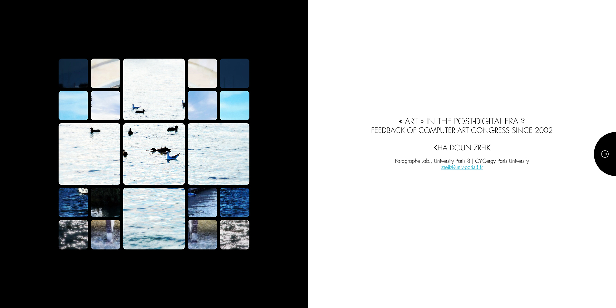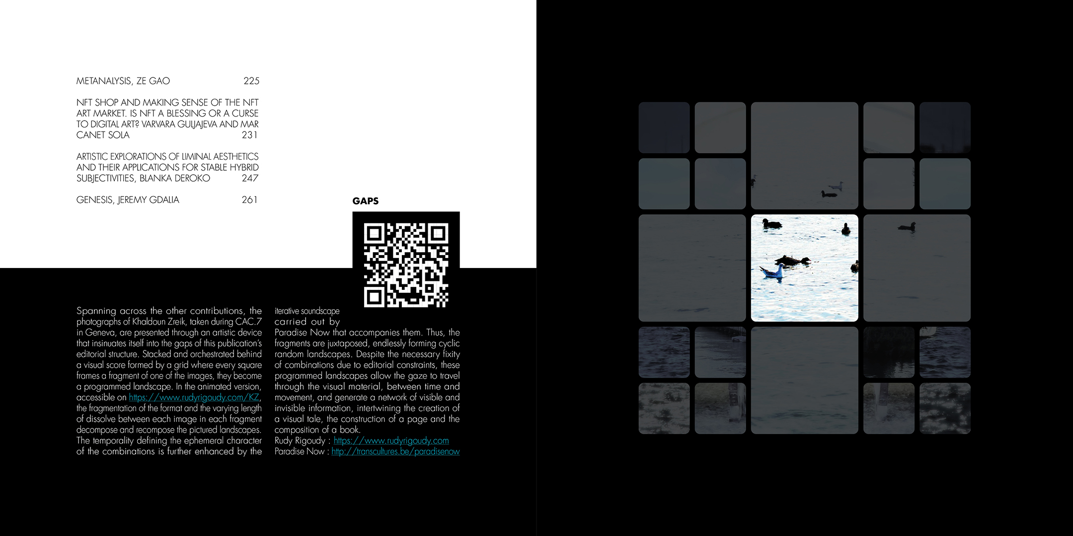 À la croisée des contributions des actes du colloque Computer Art Congress 7 (CAC7) que j’ai mis en page pour Europia productions, les photographies de Khaldoun Zreik, récoltées pendant la durée du CAC7 à Genève, sont mise en scène dans Gaps, un dispositif artistique s’immisçant dans les interstices de la structure éditoriale de cet ouvrage. Empilées et orchestrées derrière une partition visuelle, formée par une grille au sein de laquelle chaque carré cadre un fragment de l’une des images, elles deviennent un paysage programmé. Dans la version animée, la fragmentation du format, et la variation des durées des fondus enchainés entre chaque image dans chaque fragment, décomposent et recomposent les paysages représentés. La temporalité, sur laquelle est orchestrée le caractère éphémère des combinaisons, est enrichie par un paysage sonore électro-organique réalisé par Paradise Now. Ainsi, les fragments se juxtaposent et composent, à l’infini, des paysages cycliques aléatoires. Malgré la nécessaire fixation des combinaisons pour répondre aux besoins éditoriaux, ce paysage programmé permet à la fois au regard de voyager dans la matière du visible, entre le temps et le mouvement, et de fabriquer un réseau d’informations, visibles et invisibles, entre la constitution d’un récit visuel, la construction d’une page et la structuration d’un livre.