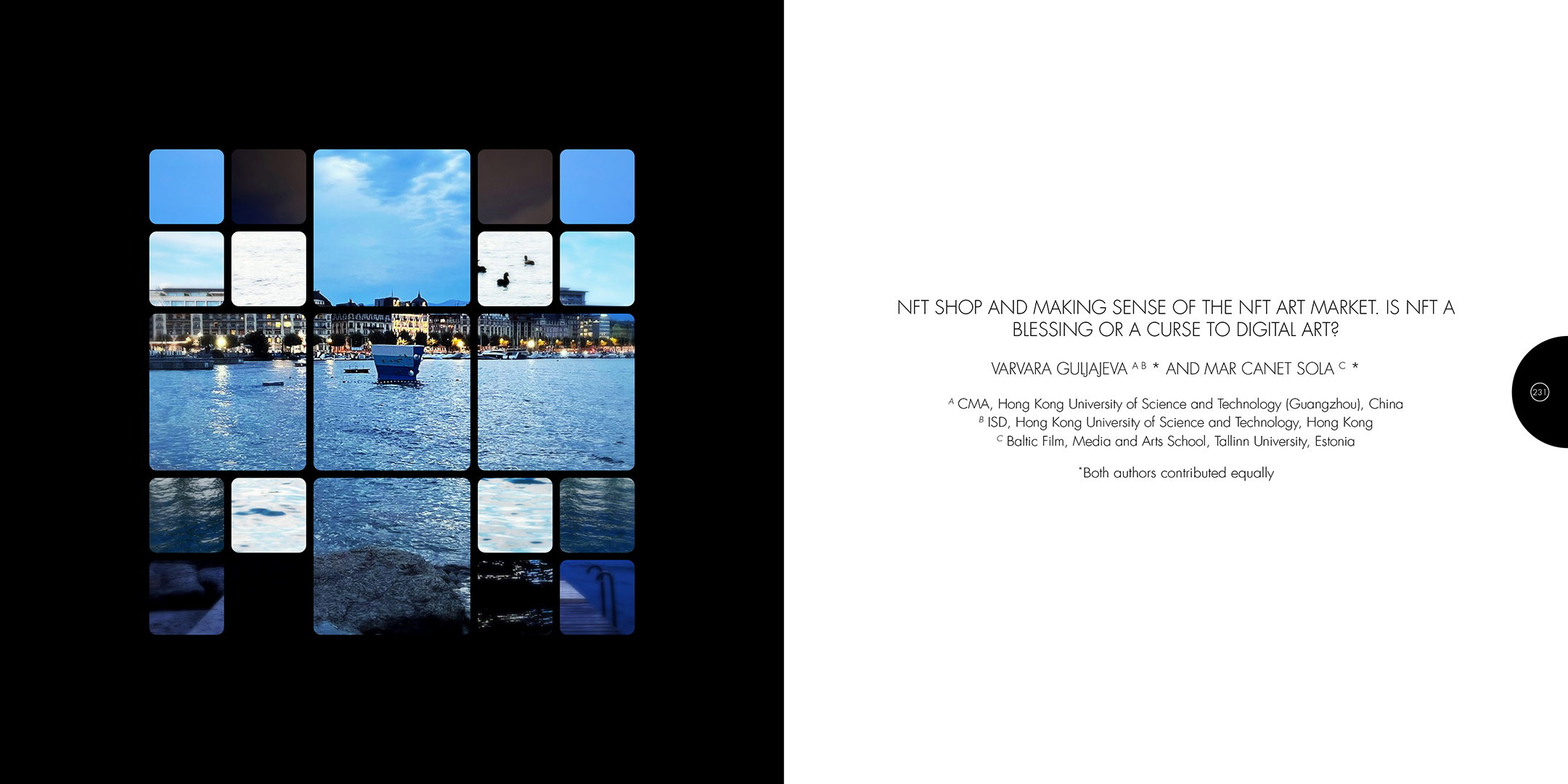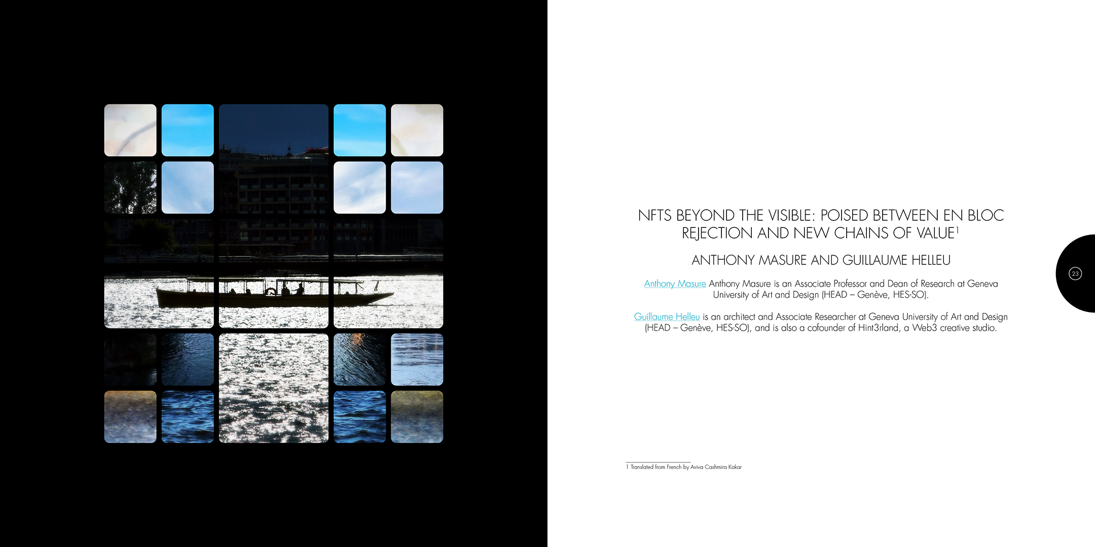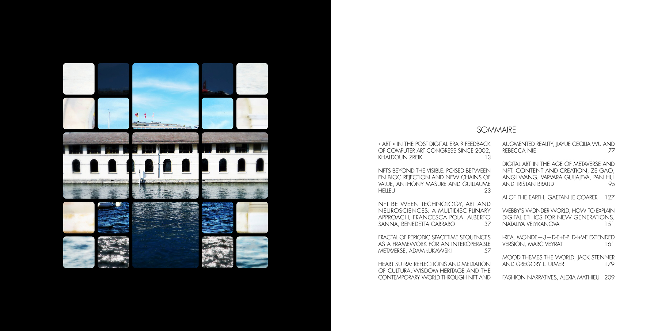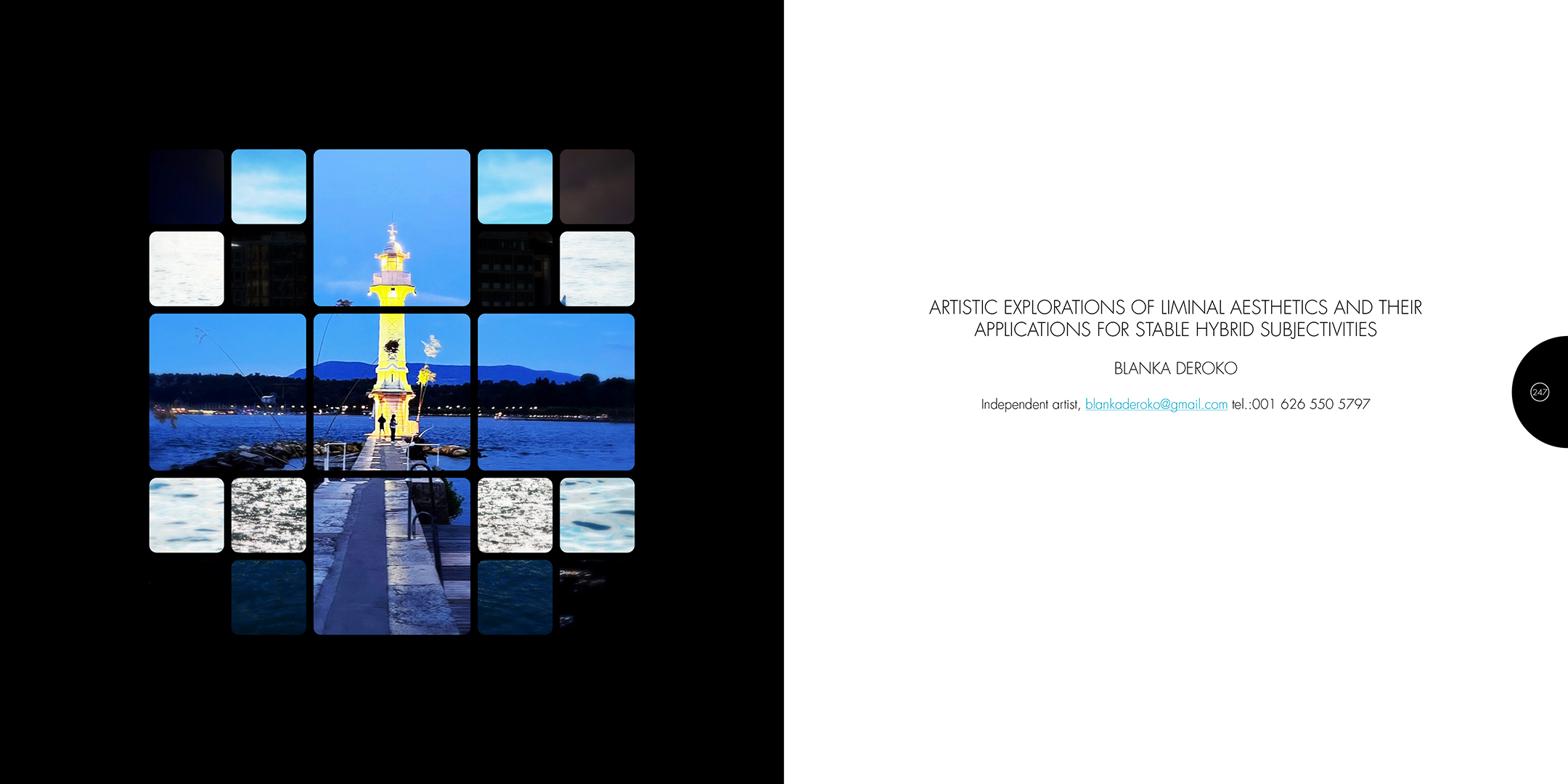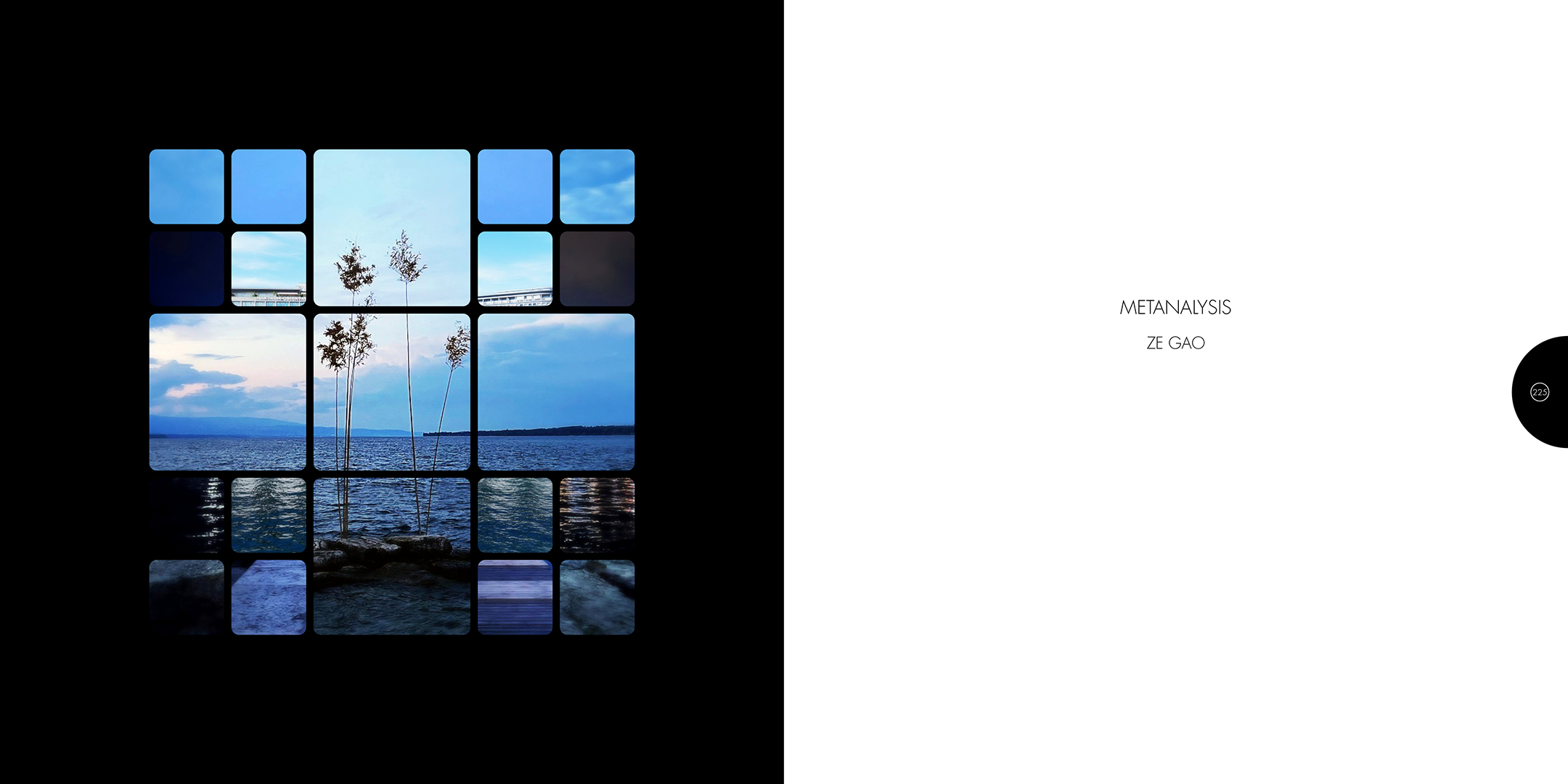 À la croisée des contributions des actes du colloque Computer Art Congress 7 (CAC7) que j’ai mis en page pour Europia productions, les photographies de Khaldoun Zreik, récoltées pendant la durée du CAC7 à Genève, sont mise en scène dans Gaps, un dispositif artistique s’immisçant dans les interstices de la structure éditoriale de cet ouvrage. Empilées et orchestrées derrière une partition visuelle, formée par une grille au sein de laquelle chaque carré cadre un fragment de l’une des images, elles deviennent un paysage programmé. Dans la version animée, la fragmentation du format, et la variation des durées des fondus enchainés entre chaque image dans chaque fragment, décomposent et recomposent les paysages représentés. La temporalité, sur laquelle est orchestrée le caractère éphémère des combinaisons, est enrichie par un paysage sonore électro-organique réalisé par Paradise Now. Ainsi, les fragments se juxtaposent et composent, à l’infini, des paysages cycliques aléatoires. Malgré la nécessaire fixation des combinaisons pour répondre aux besoins éditoriaux, ce paysage programmé permet à la fois au regard de voyager dans la matière du visible, entre le temps et le mouvement, et de fabriquer un réseau d’informations, visibles et invisibles, entre la constitution d’un récit visuel, la construction d’une page et la structuration d’un livre.