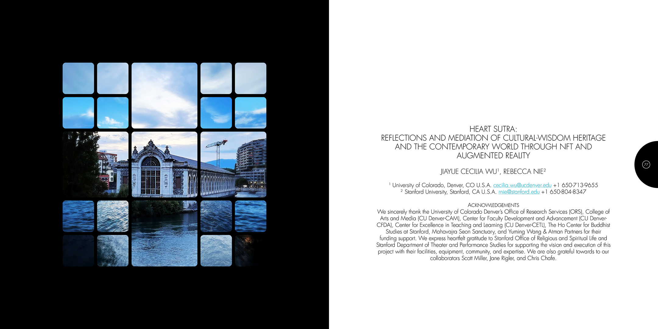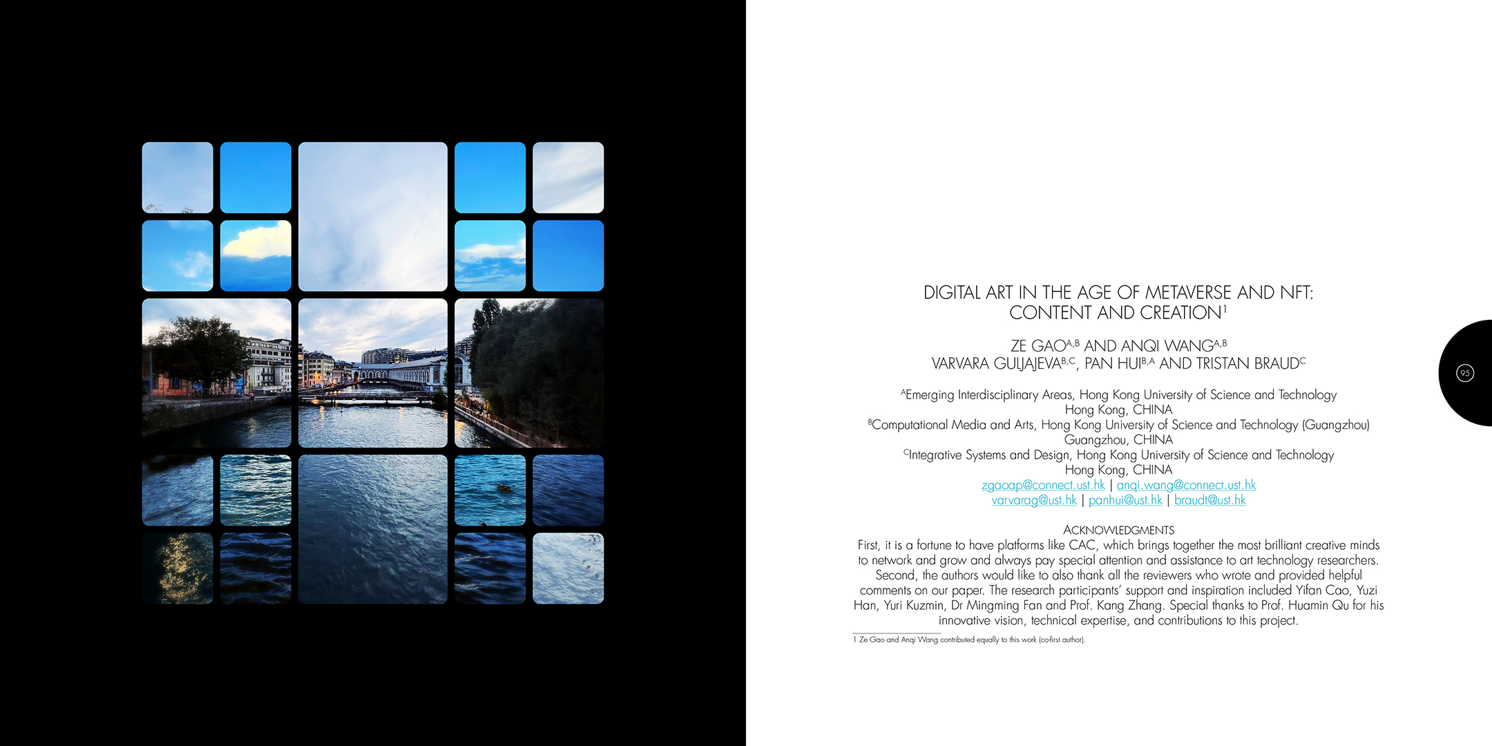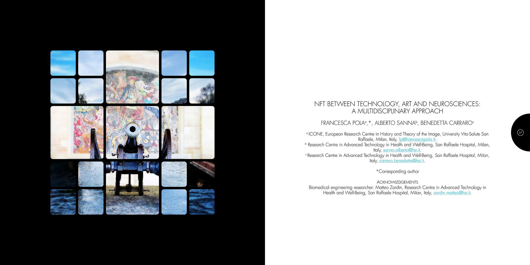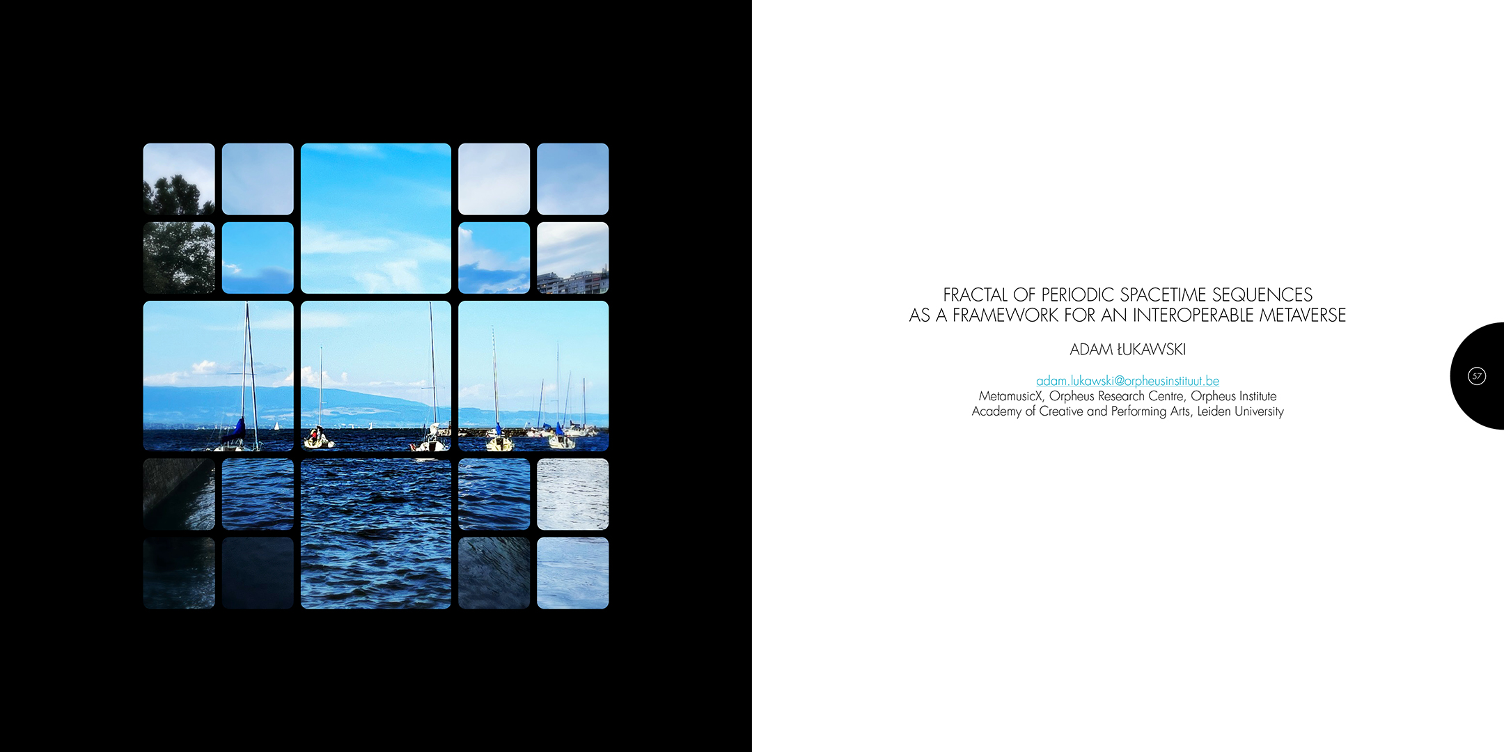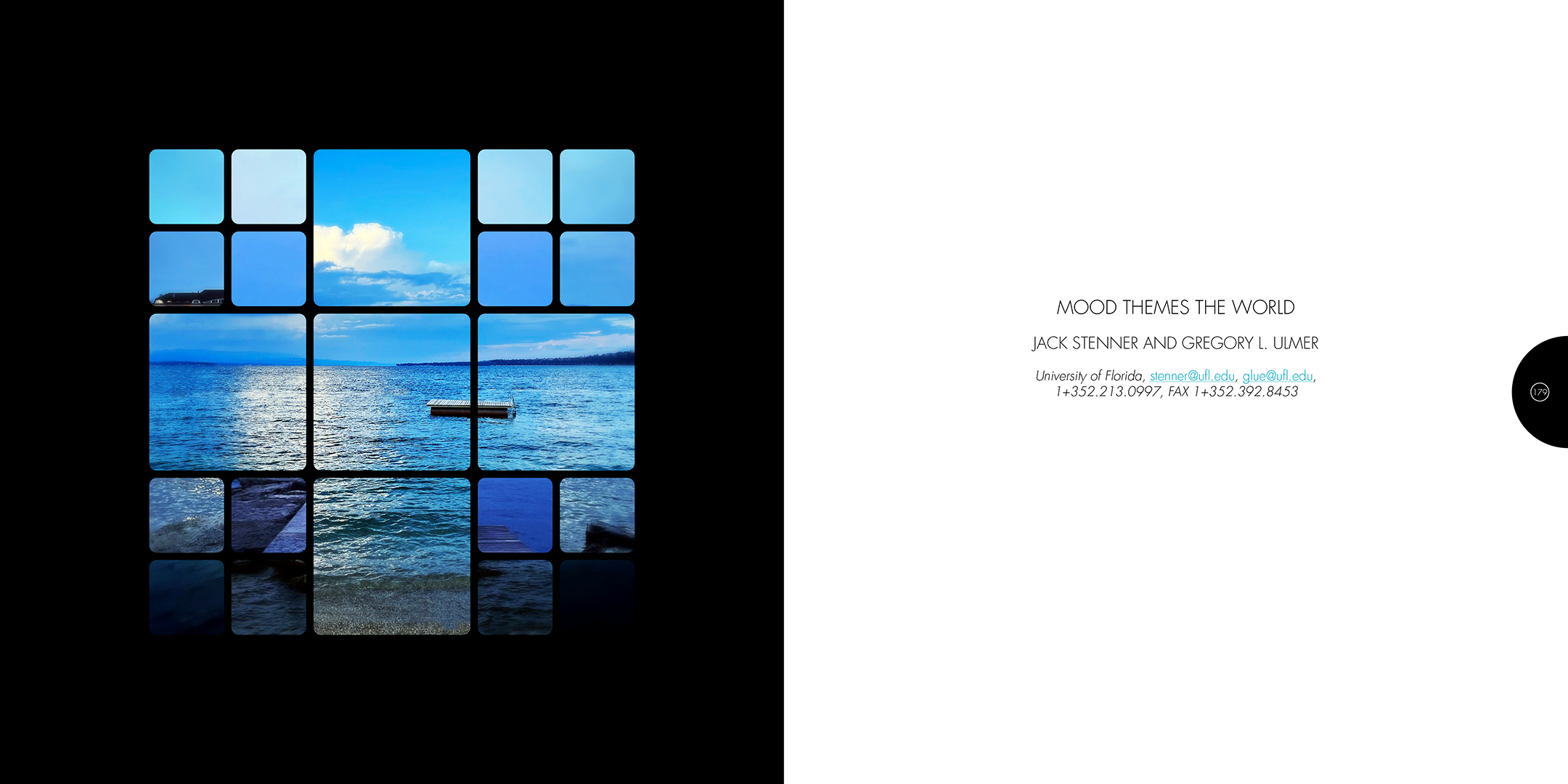 À la croisée des contributions des actes du colloque Computer Art Congress 7 (CAC7) que j’ai mis en page pour Europia productions, les photographies de Khaldoun Zreik, récoltées pendant la durée du CAC7 à Genève, sont mise en scène dans Gaps, un dispositif artistique s’immisçant dans les interstices de la structure éditoriale de cet ouvrage. Empilées et orchestrées derrière une partition visuelle, formée par une grille au sein de laquelle chaque carré cadre un fragment de l’une des images, elles deviennent un paysage programmé. Dans la version animée, la fragmentation du format, et la variation des durées des fondus enchainés entre chaque image dans chaque fragment, décomposent et recomposent les paysages représentés. La temporalité, sur laquelle est orchestrée le caractère éphémère des combinaisons, est enrichie par un paysage sonore électro-organique réalisé par Paradise Now. Ainsi, les fragments se juxtaposent et composent, à l’infini, des paysages cycliques aléatoires. Malgré la nécessaire fixation des combinaisons pour répondre aux besoins éditoriaux, ce paysage programmé permet à la fois au regard de voyager dans la matière du visible, entre le temps et le mouvement, et de fabriquer un réseau d’informations, visibles et invisibles, entre la constitution d’un récit visuel, la construction d’une page et la structuration d’un livre.