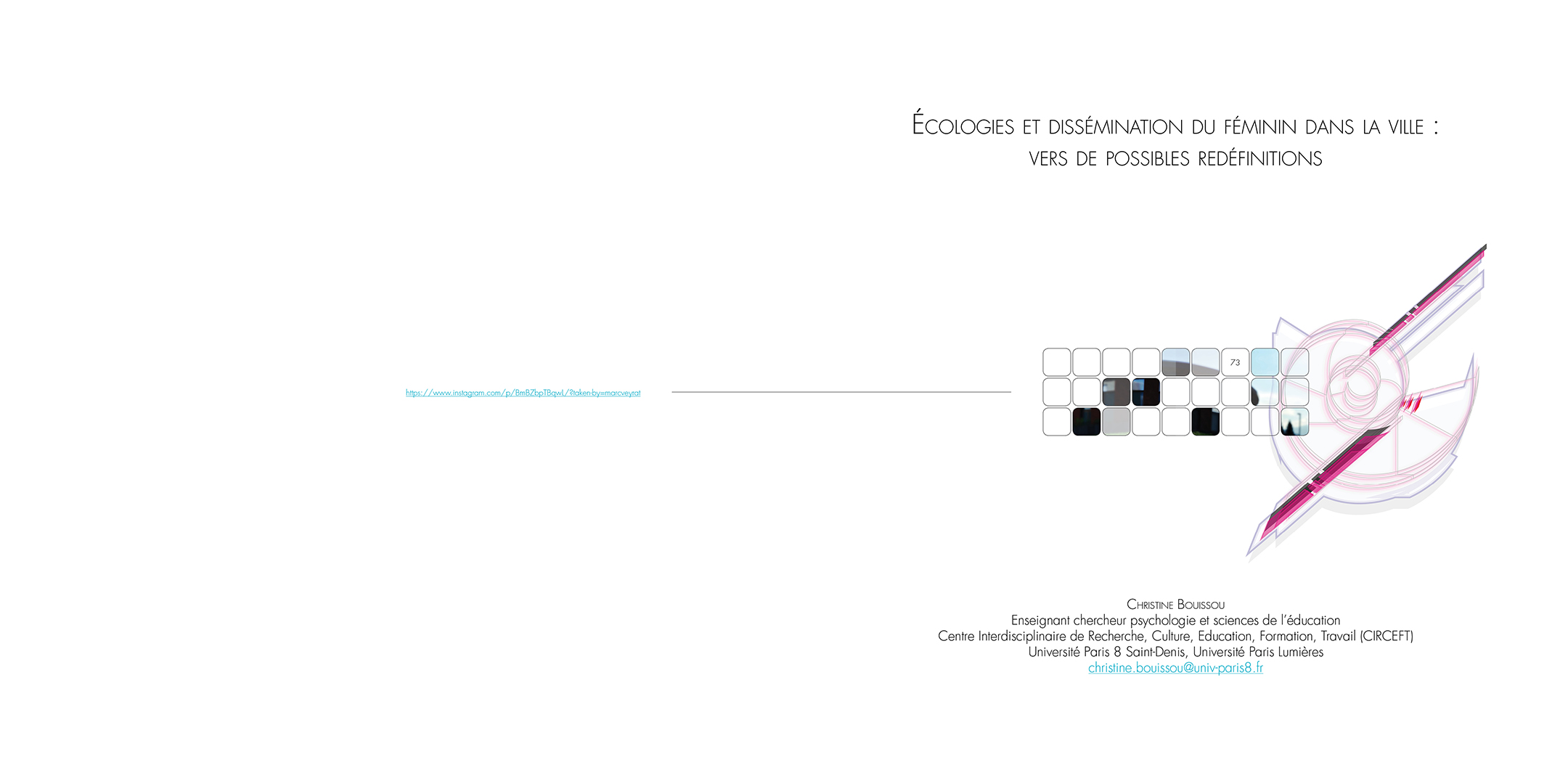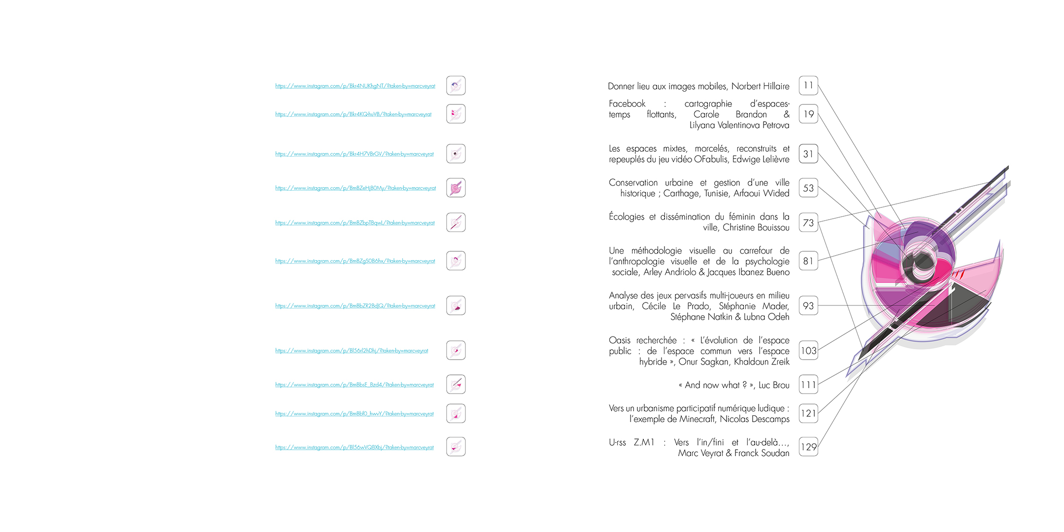 Dans la mise en page du livre, Marc et moi avons finalement décidé d’utiliser les images obtenues avec mon fils en ouverture de chapitre. Nous les avons associées aux i+D/signes que Marc a créé pour chaque auteur. Et, en bas de chaque page, seule les grilles avec le numéro de page apparaissent. Elles correspondent aux combinaisons obtenues par le jeu, sans l’image du bâtiment.