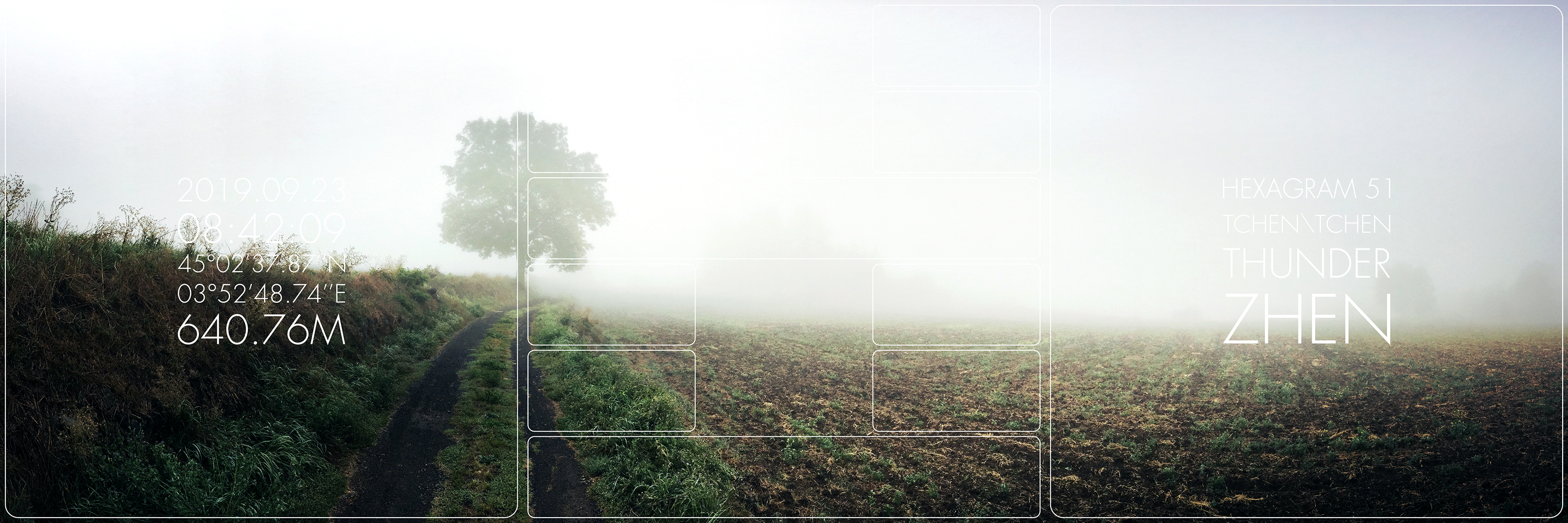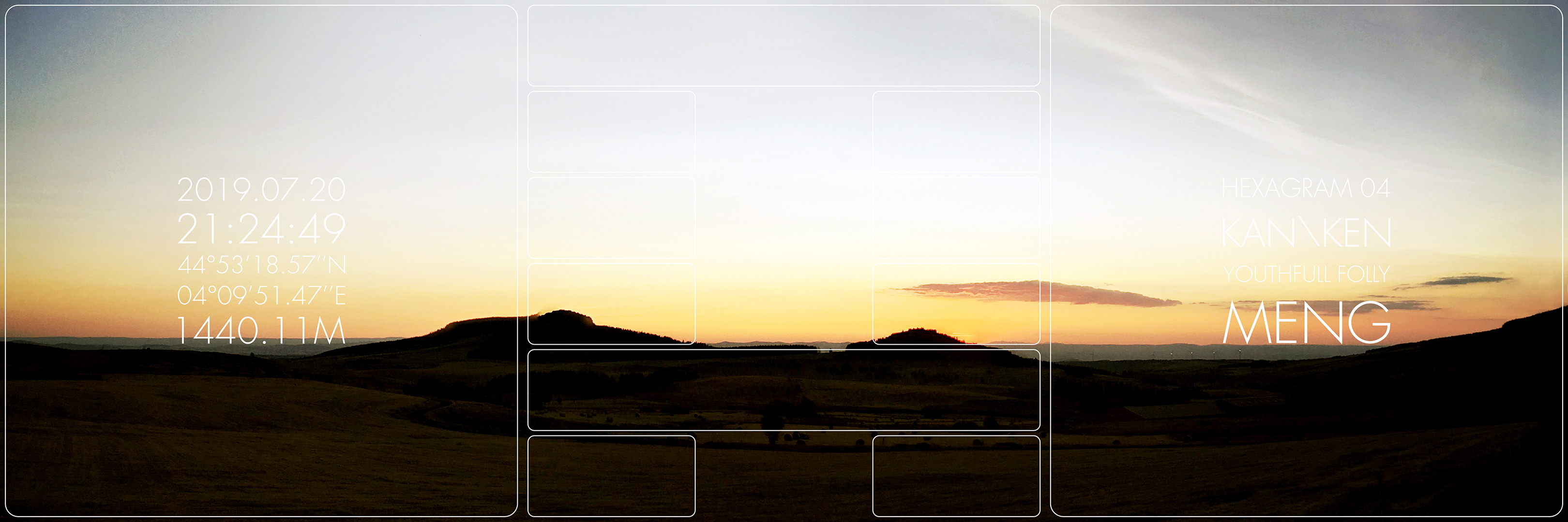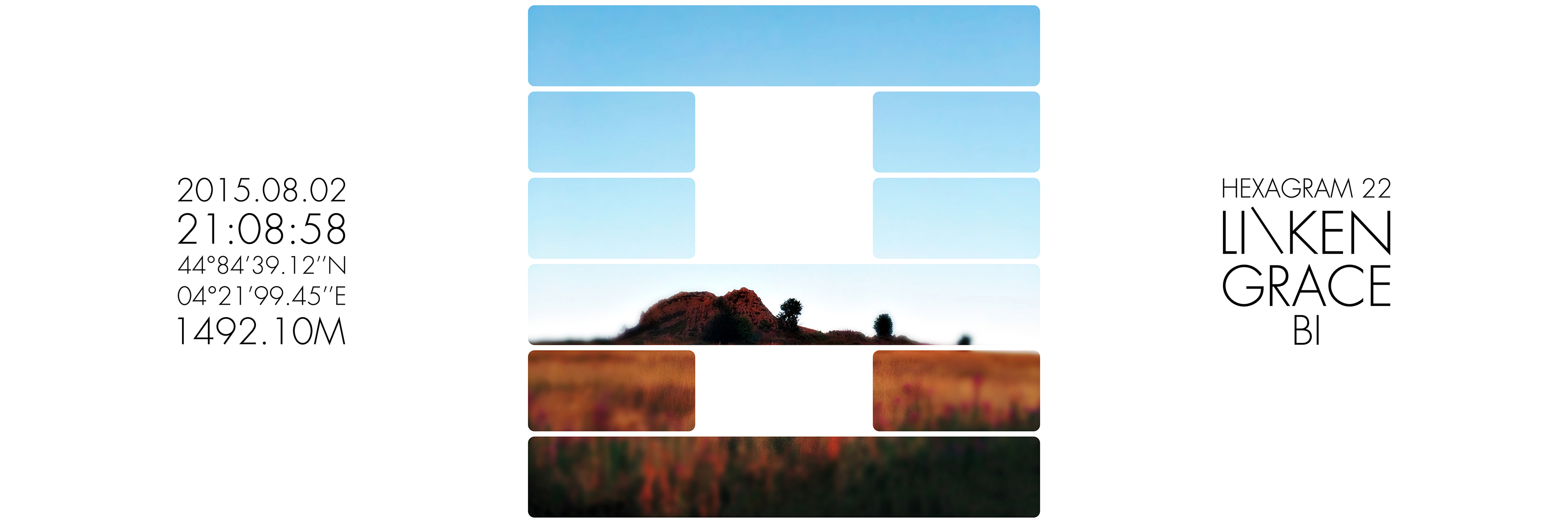 What’s up ? est une série de triptyque dans laquelle j’interroge les moyens de transcription de l’expérience de présence dans le paysage. Inspiré des travaux de Joseph Kosuth ou d’Hamish Fulton, le carré gauche donne des informations factuelles et objectives de la géographie de mon point de vue au moment de la prise de vue. L’image centrale du triptyque est composée d’un paysage photographique sur lequel apparait un hexagramme. Un masque blanc rend visible alternativement six lignes horizontales continues et/ou discontinues. Cet hexagramme est obtenu par la consultation du Yi king, un art divinatoire chinois basé sur le Livre des transformations. Selon Richard Wilhelm, il contient le fruit de la sagesse millénaire chinoise dont l’objectif est de transcrire symboliquement les états du monde dans leurs mouvements, leurs mutations et leurs relations aux individus. Le troisième carré, sur la droite du triptyque, indique quel hexagramme est lié au paysage photographique du triptyque. Mon intention est de donner, par cet ensemble, l’image de phénomènes de synchronicité. En quelque sorte, chaque triptyque montre ce que je regarde et évoque, par le Yi king, ce que le monde me donne à voir, à sentir et à penser – en fonction de nos états respectifs et de notre échange – à l’instant de l’acte photographique.