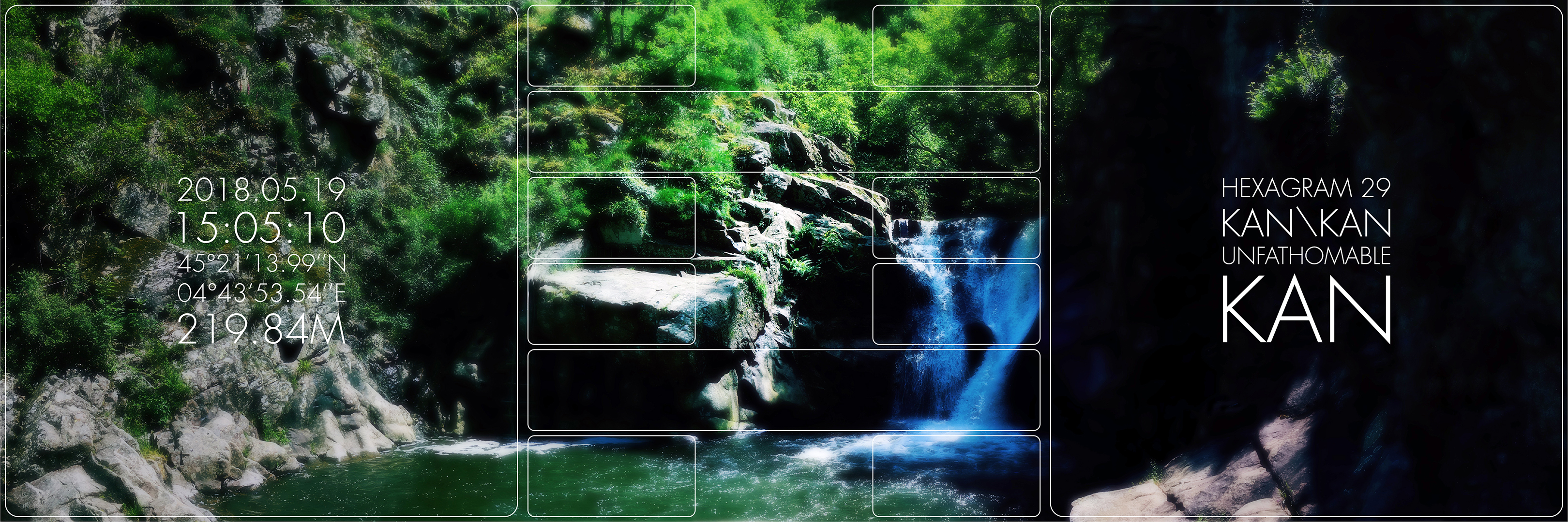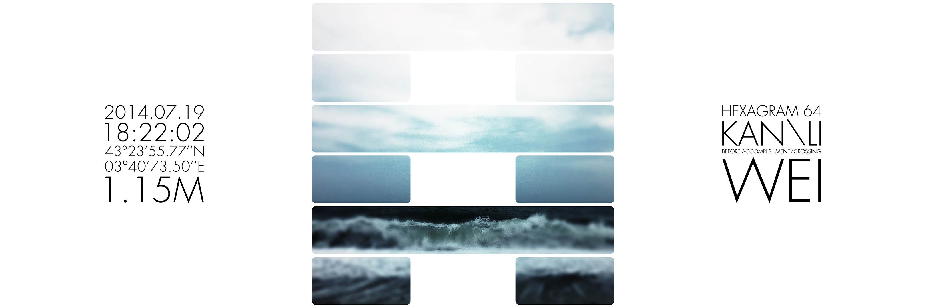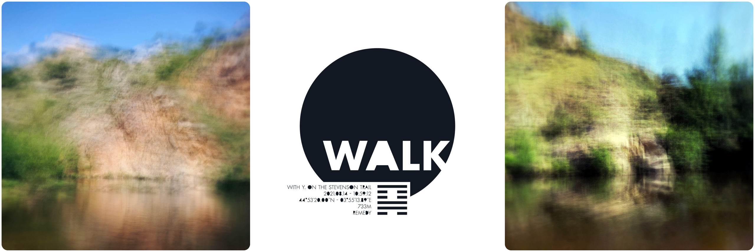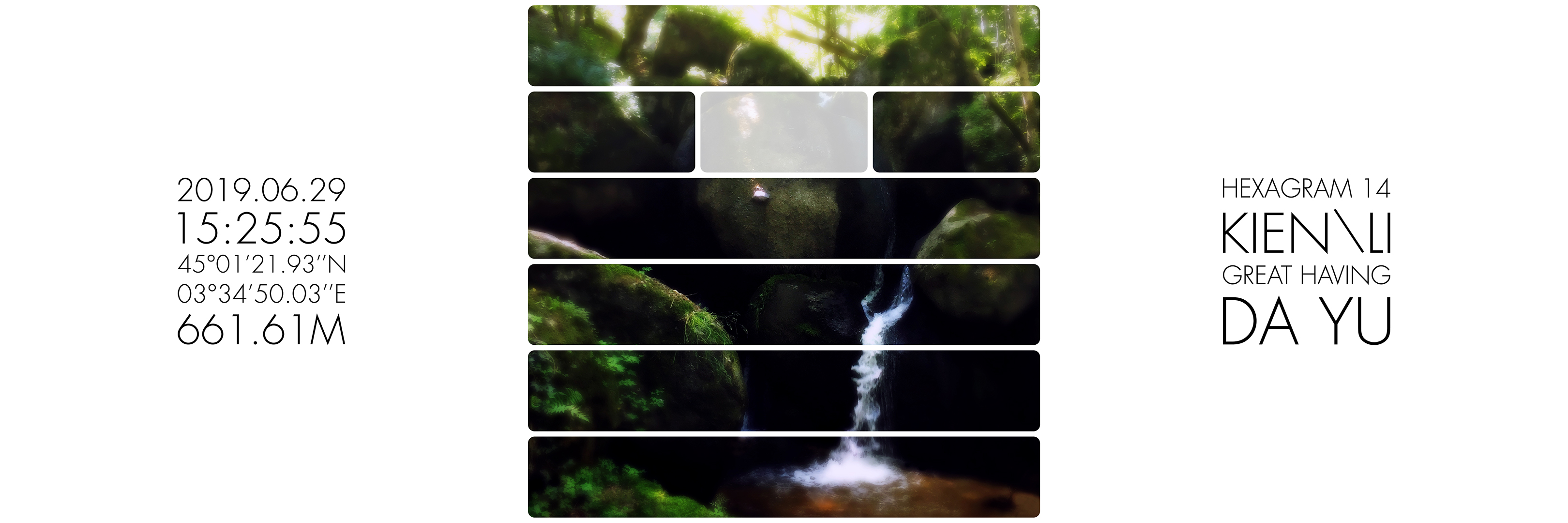 What’s up ? est une série de triptyque dans laquelle j’interroge les moyens de transcription de l’expérience de présence dans le paysage. Inspiré des travaux de Joseph Kosuth ou d’Hamish Fulton, le carré gauche donne des informations factuelles et objectives de la géographie de mon point de vue au moment de la prise de vue. L’image centrale du triptyque est composée d’un paysage photographique sur lequel apparait un hexagramme. Un masque blanc rend visible alternativement six lignes horizontales continues et/ou discontinues. Cet hexagramme est obtenu par la consultation du Yi king, un art divinatoire chinois basé sur le Livre des transformations. Selon Richard Wilhelm, il contient le fruit de la sagesse millénaire chinoise dont l’objectif est de transcrire symboliquement les états du monde dans leurs mouvements, leurs mutations et leurs relations aux individus. Le troisième carré, sur la droite du triptyque, indique quel hexagramme est lié au paysage photographique du triptyque. Mon intention est de donner, par cet ensemble, l’image de phénomènes de synchronicité. En quelque sorte, chaque triptyque montre ce que je regarde et évoque, par le Yi king, ce que le monde me donne à voir, à sentir et à penser – en fonction de nos états respectifs et de notre échange – à l’instant de l’acte photographique.
