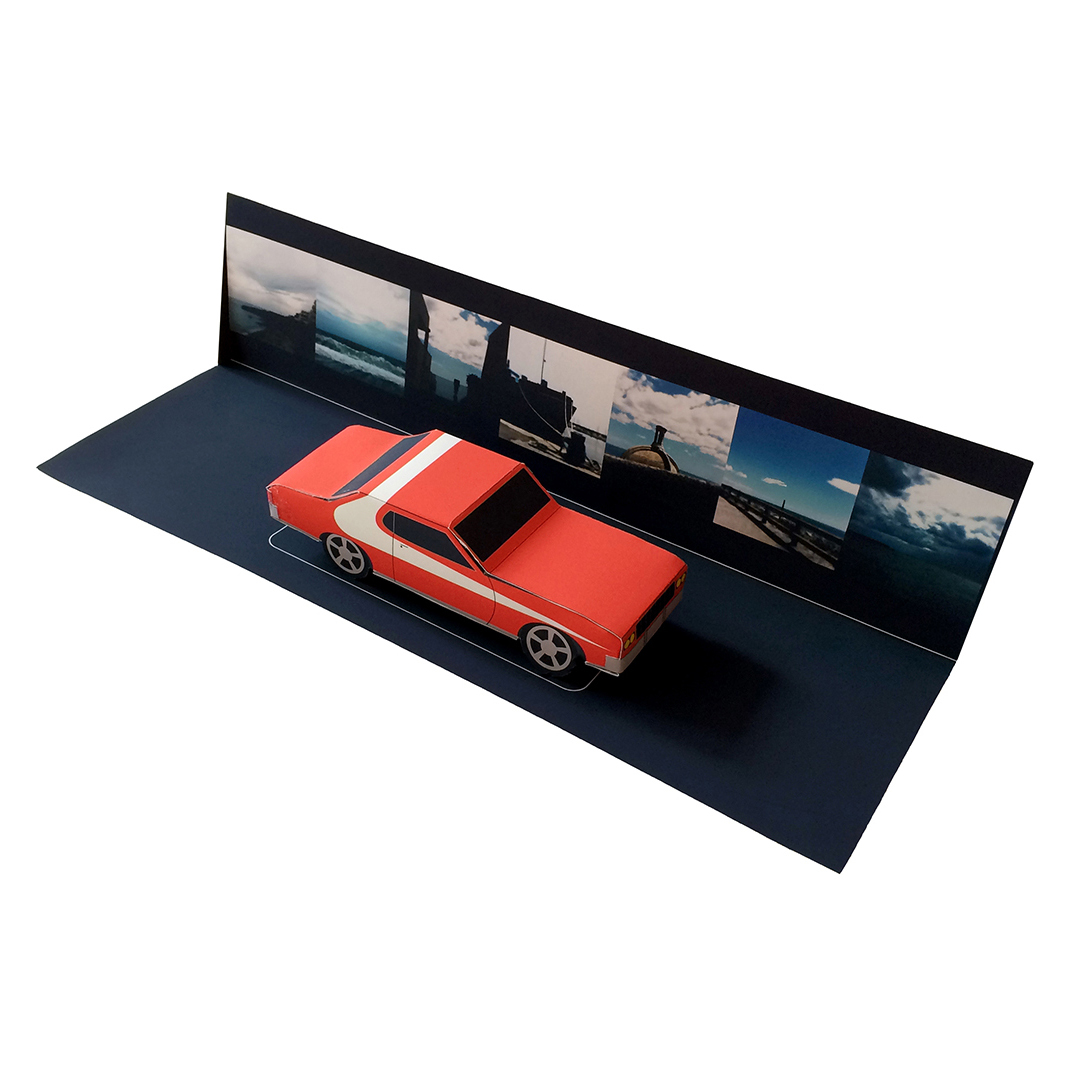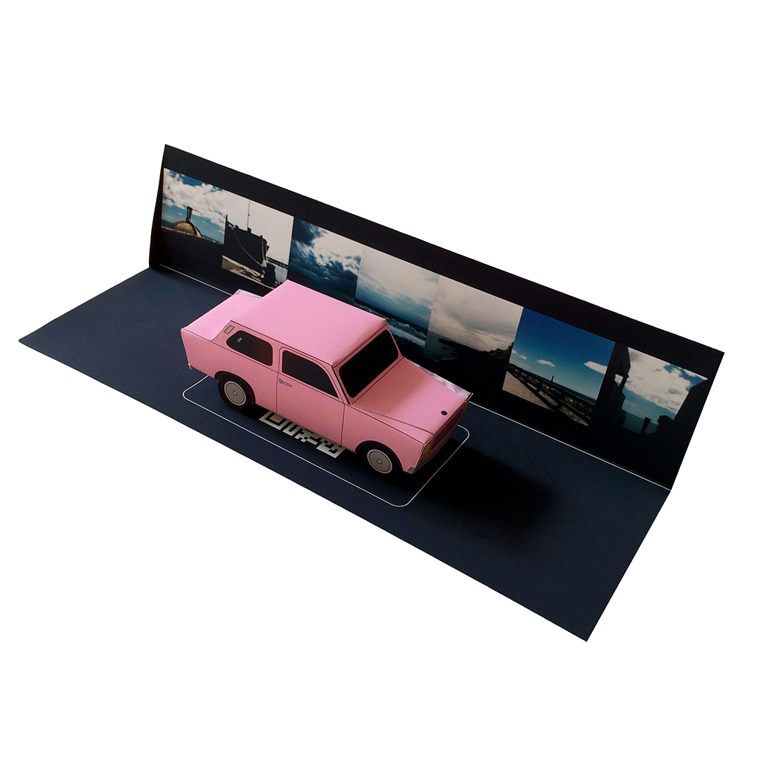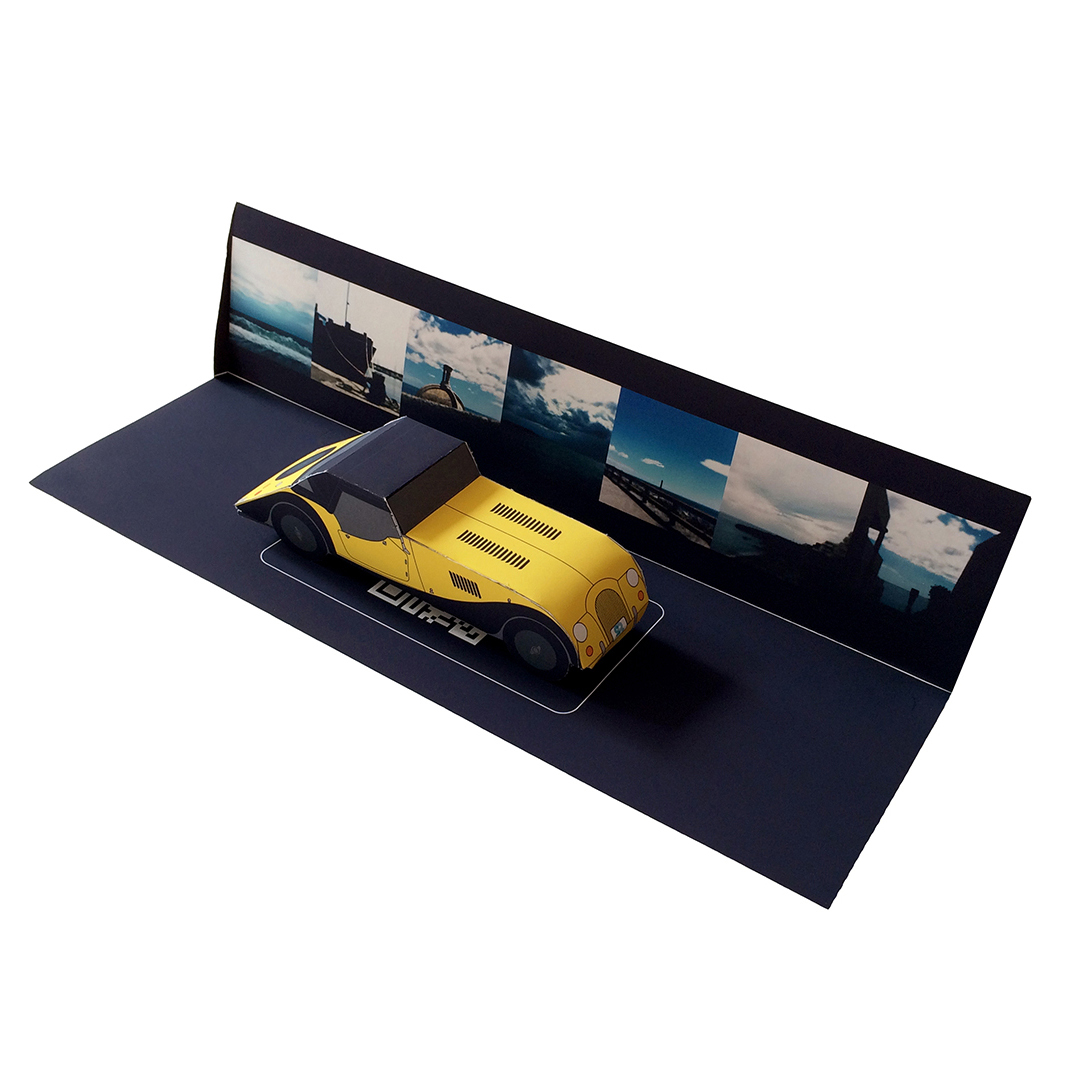 Des multiples – considérés comme des portes d’entrée – intègrent également le dispositif et se déploient autour de lui. Les paper toy de voitures – installés sur un support papier en trois dimensions où figure une combinaison du panorama de #7 Day by day – en sont une illustration. Chargés d’un imaginaire et d’une culture collective, ils évoquent les déplacements du corps dans le paysage. Les automobiles autant que les smartphones sont des machines de vision et, comme l’explique Norbert Hillaire au sujet de ses Photomobiles, « ils structurent notre point de vue sur le réel dans notre mobilité quotidienne et témoignent de l’impossibilité d’arrêter le flux du temps tout en l’arrêtant quand même ». Dès lors, le paysage se contemple dans un flux d’espaces (im)mobiles.