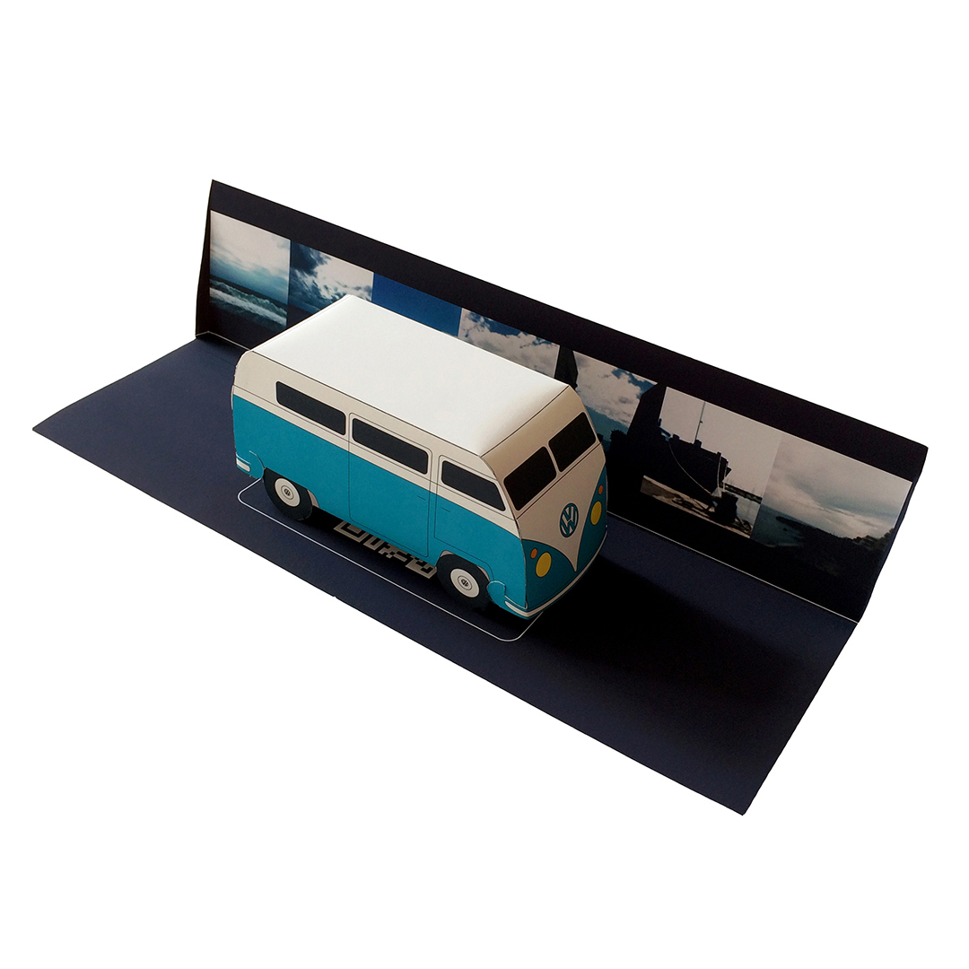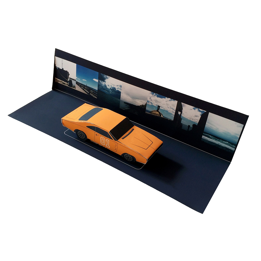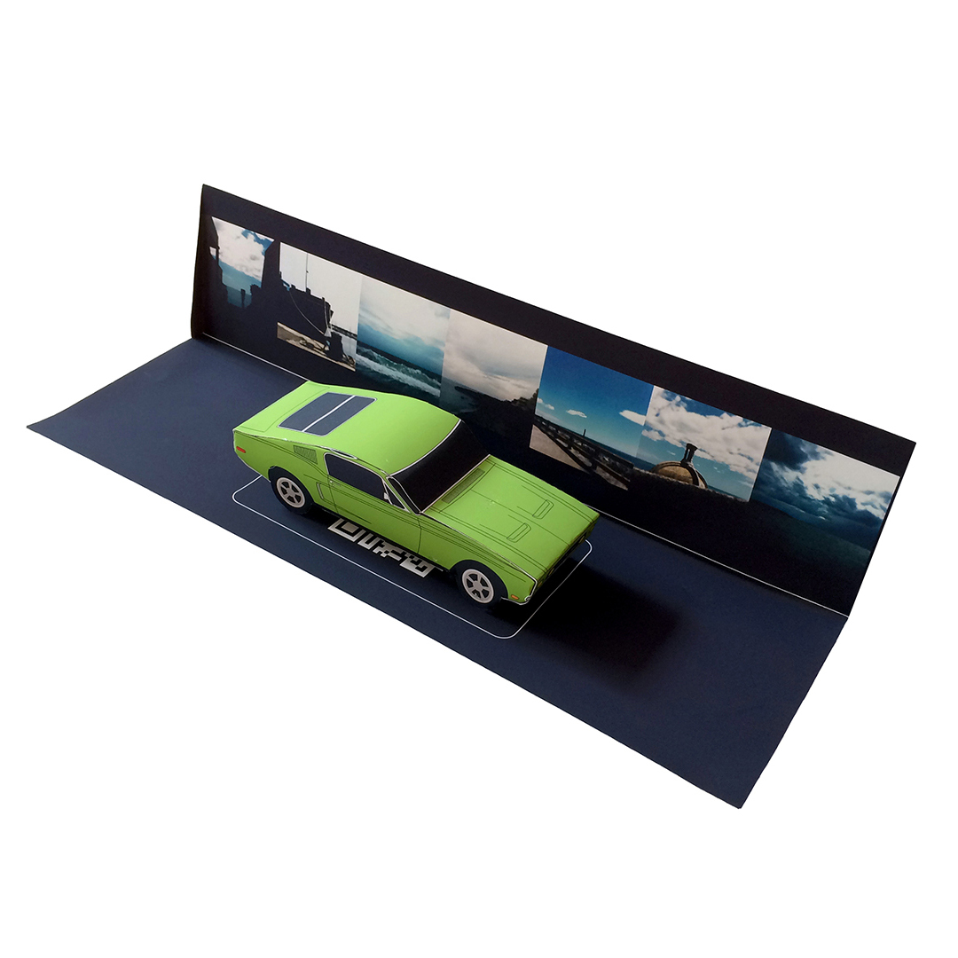 Des multiples – considérés comme des portes d’entrée – intègrent également le dispositif et se déploient autour de lui. Les paper toy de voitures – installés sur un support papier en trois dimensions où figure une combinaison du panorama de #7 Day by day – en sont une illustration. Chargés d’un imaginaire et d’une culture collective, ils évoquent les déplacements du corps dans le paysage. Les automobiles autant que les smartphones sont des machines de vision et, comme l’explique Norbert Hillaire au sujet de ses Photomobiles, « ils structurent notre point de vue sur le réel dans notre mobilité quotidienne et témoignent de l’impossibilité d’arrêter le flux du temps tout en l’arrêtant quand même ». Dès lors, le paysage se contemple dans un flux d’espaces (im)mobiles.
